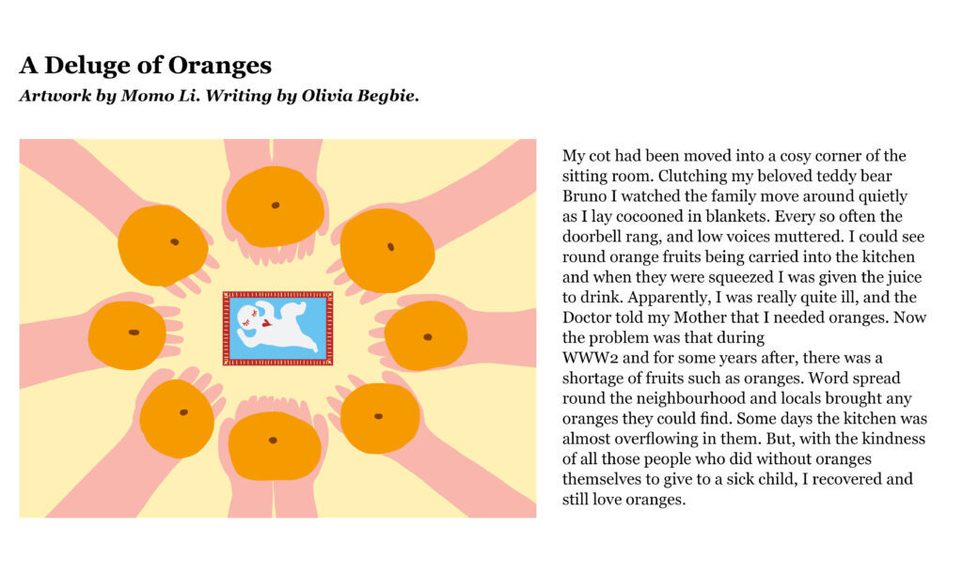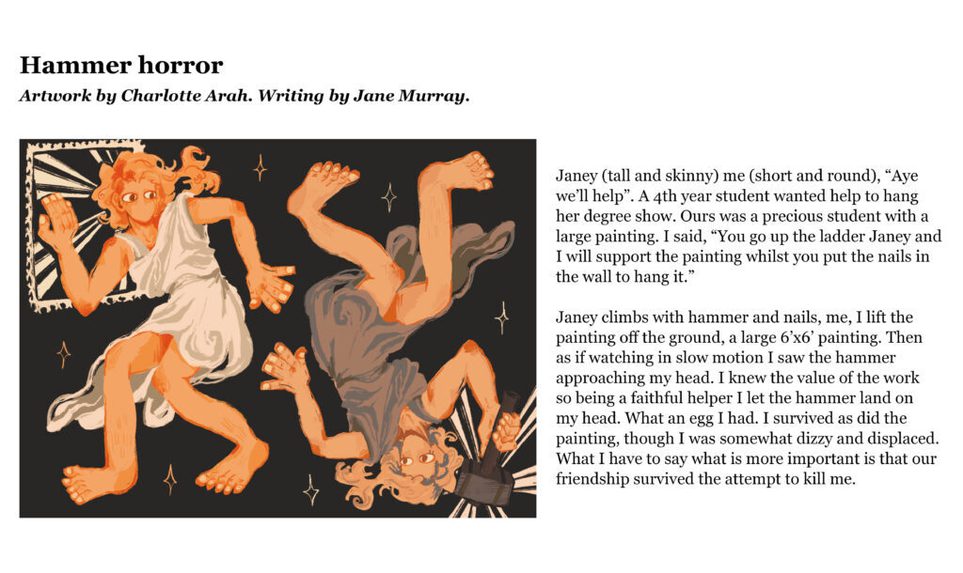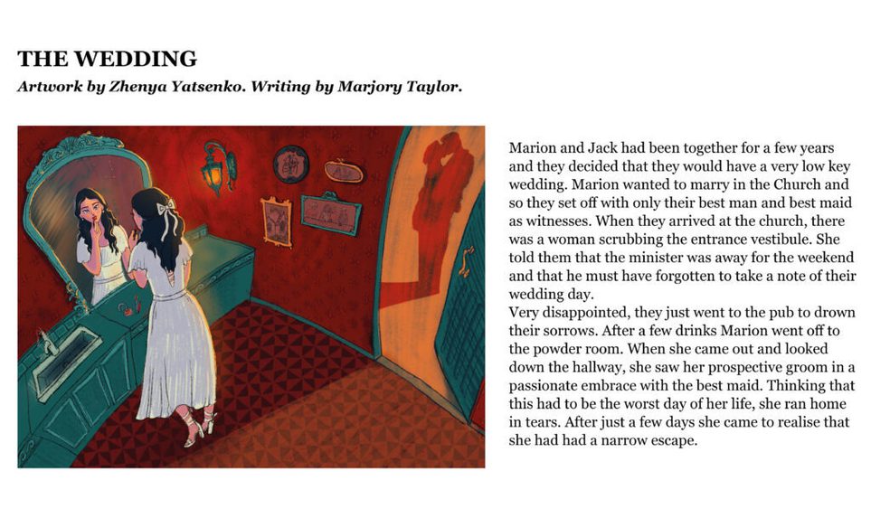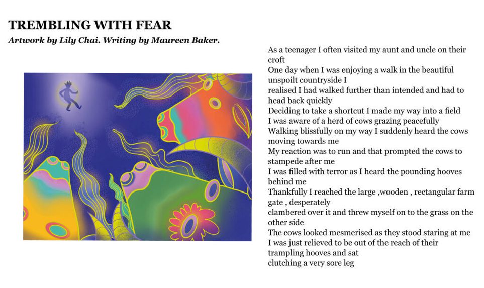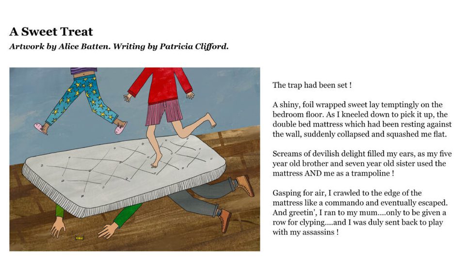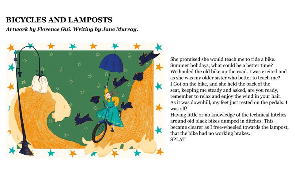 The Citizen Writers’ collection of stories seemed like a perfect match for an illustration project, so it was wonderful to be able to pair the writers with Edinburgh College of Art’s illustration students. Everyone was delighted with the results of this collaboration, and the idea of making our postcards two-sided, with an illustration on one side, and a story on the other. We also had a really enjoyable visit to ECA to meet the artists and find out how they created their illustrations.